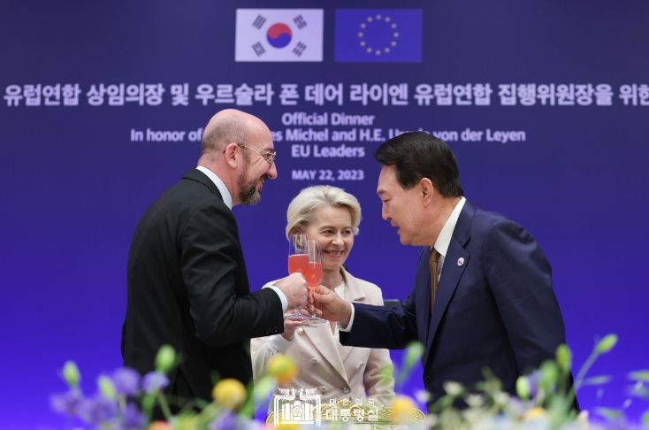 [제주교통복지신문 김강석 기자] 윤석열 대통령은 5. 22일 한-EU 정상회담이 끝난 후, 용산 대통령실에서 샤를 미셸 EU 상임의장과 우르술라 폰 데어 라이엔 EU 집행위원장을 초청해 만찬을 가졌다.
