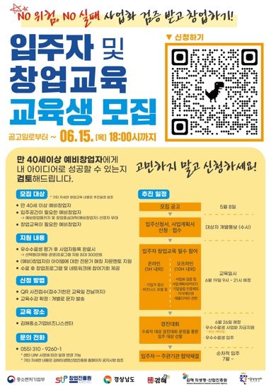 한편, 만40세 이상 예비창업자를 발굴 및 성장지원하는 김해시 중장년기술창업센터는 2023년 5월 입주자 및 맞춤형 창업과정 창업교육생을 현재 모집 중이며, 해당 과정 우수 수료자에게는 입주공간 지원 및 선택형 프로그램(최대300만원)을 지원할 예정이다.