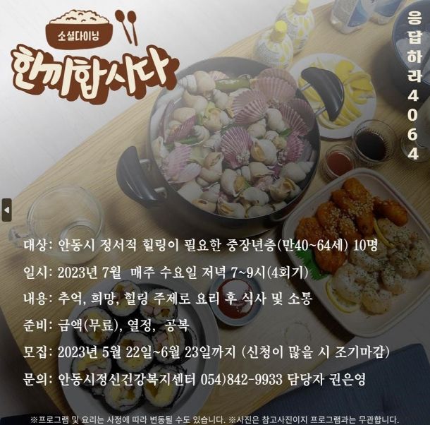 ⌜한끼합시다⌟는 중장년층이 요리를 매개로 함께 소통할 수 있는 장을 마련하여 정서적 고립을 해소하고 안정을 도모하기 위해 7월 매주 수요일에 운영할 예정이다.