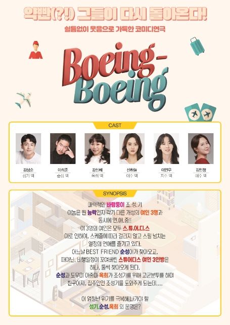 연극 ‘보잉보잉’은 스위스 출신의 극작가 마르끄 까몰레띠의 대본을 국내 실정에 맞게 각색한 작품으로 B급 코미디의 진수를 보여준다.