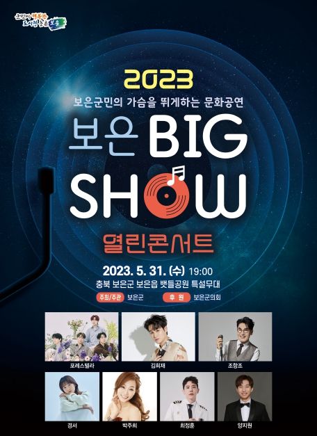 [제주교통복지신문 김강석 기자] 보은군은 오는 31일 오후 7시 뱃들공원 특설무대에서 군민들의 가슴을 뛰게 할‘2023 보은 빅쇼 열린콘서트’가 개최한다고 23일 밝혔다.