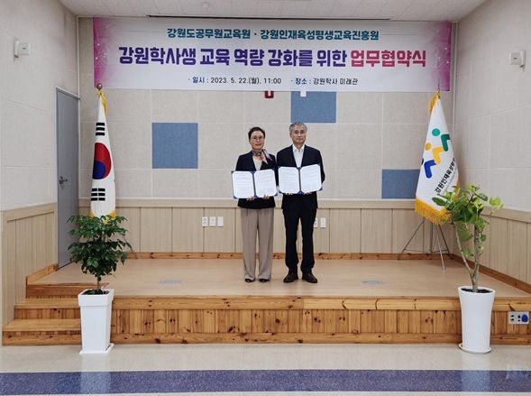 [제주교통복지신문 김강석 기자] 강원도공무원교육원(원장 최형자)과 강원인재육성평생교육진흥원(원장 손인주)은 2023년 5월 22일 강원관악학사에서 강원학사생 역량강화 지원을 위한 업무협약을 체결했다고 밝혔다.