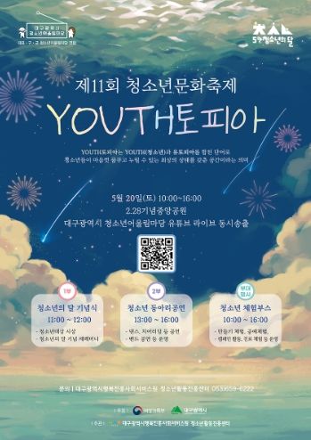 청소년문화축제는 청소년 달을 기념하여 시와 구·군 청소년 시설 및 청소년들이 연합해 기획·운영하는 청소년 축제로 1부 행사는 ▷제35회 대구광역시 청소년대상 시상식 ▷청소년 대표 4명의 청소년헌장 낭독 ▷청소년들이 마음껏 꿈꾸고 누릴 수 있는 ‘Youth토피아’의 문을 여는 세리머니 순으로 진행됐다.