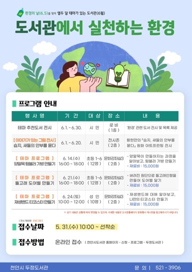 [제주교통복지신문 김강석 기자] 천안시 두정도서관은 ‘열두 달 테마가 있는 도서관’의 6월 테마로 ‘환경’과 관련된 프로그램을 운영한다고 23일 밝혔다.