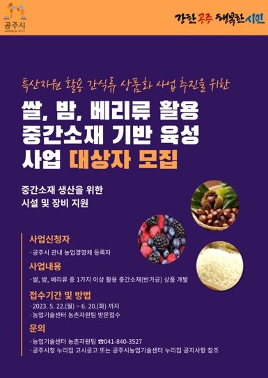 중간소재 기반 육성사업에 관한 자세한 사항은 공주시청 누리집의 고시공고 또는 공주시농업기술센터 누리집을 참고하면 된다.