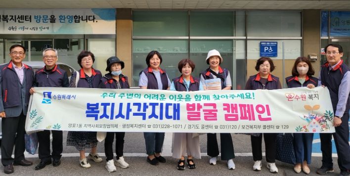 [제주교통복지신문 김강석 기자] 수원시 망포1동 지역사회보장협의체는 지난 22일 태장사거리 일대와 주택가 중심으로 복지사각지대 발굴 캠페인을 실시했다.