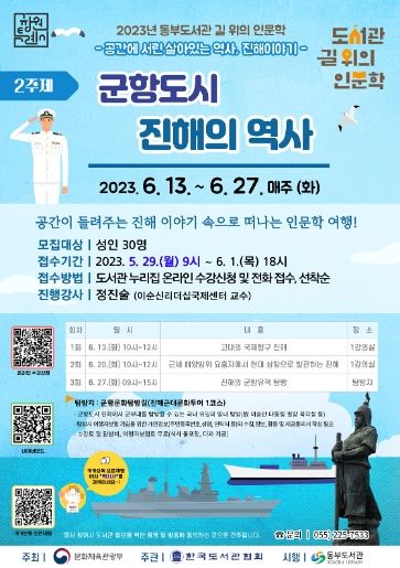강좌는 6월 13일부터 6월 27일까지 매주 화요일 10시~12시(탐방: 6월 27일 9시~15시) 총 3회 운영되며, 수강료 및 탐방료는 무료이다. 특히 2주제 탐방코스인 ‘군항문화탐방’은 진해에서 군부대를 탐방할 수 있는 국내 유일의 영내탐방 관광으로 해군사관학교 내 군항유적, 거북선, 故 이승만 대통령 별장 등을 둘러볼 수 있다. 강연과 탐방, 독서가 연계된 ‘길 위의 인문학’을 통해 군항도시로서의 진해를 알아가는 뜻깊은 시간이 될 것이다.