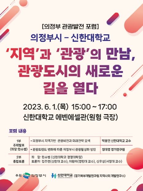 [제주교통복지신문 김강석 기자] 의정부시는 6월 1일 오후 3시 신한대학교 에벤에셀관(원형극장)에서 ‘의정부시·신한대학교 관광발전 포럼’을 개최한다.