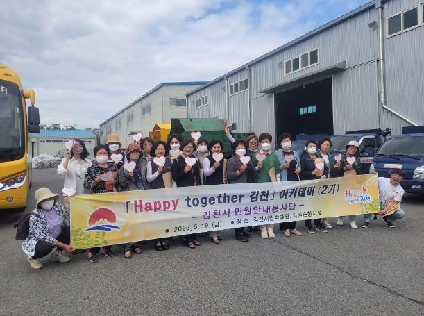 이날 간담회는 김천시에서 주최하는 'Happy together 아카데미' 프로그램과 운영되어 환경사업소를 방문하여 자원 순환시설 견학, 친절 강사 교육 등을 진행했다. 또한 그동안 봉사를 하면서 느낀 점, 민원 안내 상담 사례 공유 등에 관한 토의와 민원 안내 자원봉사단 활성화 방안에 대해 토의했다.