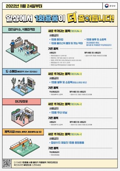 올해 11월 23일까지 계도기간이 종료되면 식품접객업 매장 내 종이컵, 플라스틱 빨대, 젓는 막대의 사용이 금지된다. 또한 편의점, 슈퍼마켓, 제과점에서 1회용 비닐봉투 사용 역시 금지돼 종이봉투, 생분해성수지제품 등만 제공 가능하다.