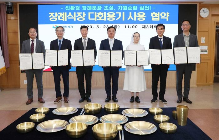 이번 협약은 장례식장에서 주로 쓰이는 1회용 컵·수저·접시·용기 등 1회용품 사용을 줄이기 위해 시와 장례식장, 지역자활센터가 힘을 모은 것이다.