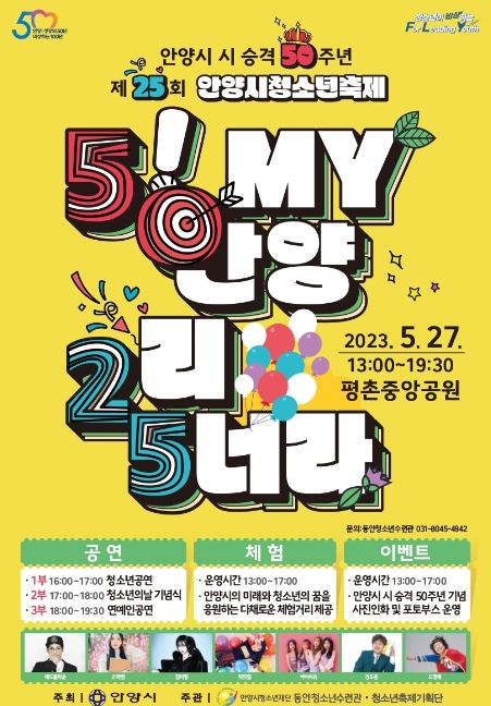 [제주교통복지신문 김강석 기자] 오는 27일 ‘안양시 청소년의 날’에 평촌중앙공원에서 제25회 안양시 청소년 축제 ‘5! my 안양 2리 5너라’가 열린다.