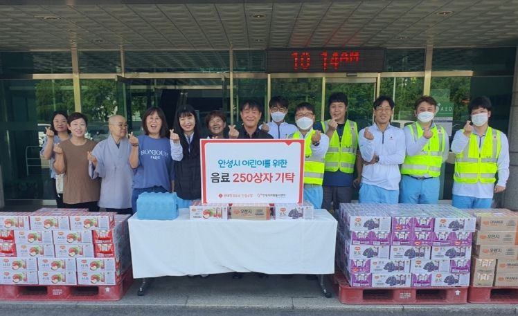 [제주교통복지신문 김강석 기자] 안성시기업사회공헌단인 롯데칠성음료(주) 안성공장이 어린이날을 기념해 5월 23일 안성시자원봉사센터에 음료 250상자를 기탁했다. 이번 후원물품은 포도 · 사과 · 오렌지 등 다양한 맛의 음료로 지역아동센터협회를 통해 어린이들에게 배분될 예정이다.