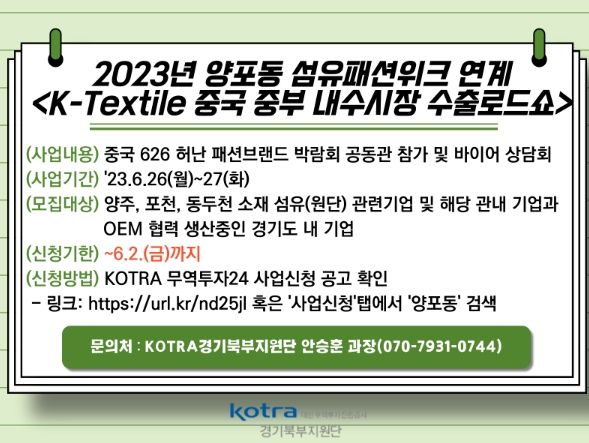 [제주교통복지신문 김강석 기자] 양주시는 2023년 양주·포천·동두천 섬유패션위크를 연계해 섬유기업의 해외 판로 개척을 위한 ‘K-Textile 중국 중부 내수시장 수출로드쇼’에 참여할 관내 섬유기업을 내달 2일까지 모집한다.