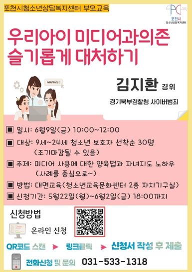 이번 교육은 6월 2일 18시까지 선착순으로 부모교육 희망자를 모집하며, 센터 홈페이지 및 카카오채널, 각 초·중·고등학교를 통해 배포되는 부모교육 포스터를 참고해 온라인(QR코드)으로 신청하거나 포천시청소년상담복지센터에 유선으로 신청할 수 있다.