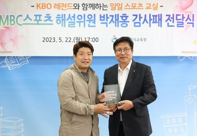 [제주교통복지신문 김강석 기자] 인천광역시교육청은 일일 야구 재능기부 활동을 진행하고 있는 박재홍 MBC스포츠 야구 해설위원에게 감사패를 전달했다고 23일 밝혔다.