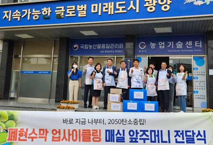 [제주교통복지신문 김강석 기자] 광양시는 광양기후환경네트워크가 매실 수확기를 앞두고 22일 농업기술센터를 방문해 폐현수막을 새활용(up-cycling)한 매실 수확용 앞치마 300장을 전달했다고 밝혔다.