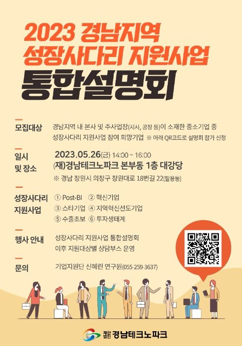 [제주교통복지신문 김강석 기자] 경상남도는 중소기업의 성장을 지원하기 위해, 오는 26일 오후 2시 경남테크노파크 본부동 1층 대강당에서 ‘2023 경남지역 성장사다리 지원사업’ 통합설명회를 시작으로 수혜기업 모집에 나선다.