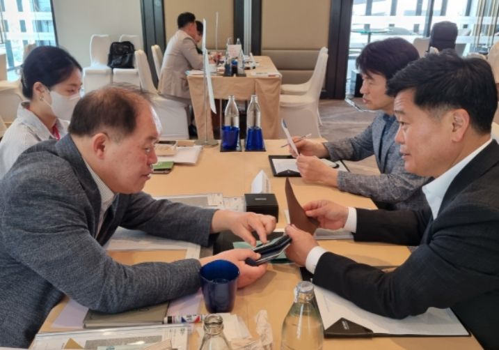 [제주교통복지신문 김강석 기자] 인천시 남동구 태국(방콕)시장개척단이 23일 태국 방콕 스카이뷰 호텔에서 현지 바이어들과 1:1 수출 상담회를 진행하고 있다.