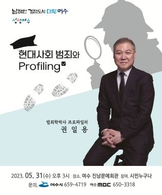 [제주교통복지신문 김강석 기자] 여수 진남문예회관에서 오는 31일 오후 3시 범죄학박사 프로파일러 권일용 초청, ‘5월 여수아카데미 시민교양강좌’가 열린다.