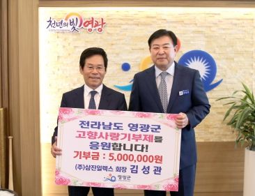 [제주교통복지신문 김강석 기자] ㈜삼진일렉스 김성관 회장이 지난 19일 영광군을 방문하여 고향사랑기부금 최고액인 5백만 원을 기부하여 고향에 온정의 마음을 전했다.