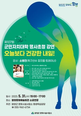 이번 군민자치대학 초청 강사는 축구선수 피지컬 트레이너로서 축구계의 약손이며 항상 곧고 푸르게 살고 싶어 ‘소나무’란 예명을 지었다는 ‘소나무 선생, 소병진’씨로 “오늘보다 건강한 내일”이라는 주제로 진행된다.
