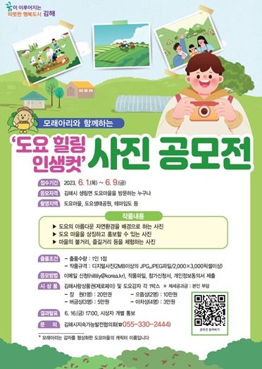 [제주교통복지신문 김강석 기자] 김해시는 김해시지속가능발전협의회와 생림면 도요마을 주관으로 모래아리와 함께하는 ‘도요 힐링 인생컷’ 사진 공모전을 개최한다고 23일 밝혔다.