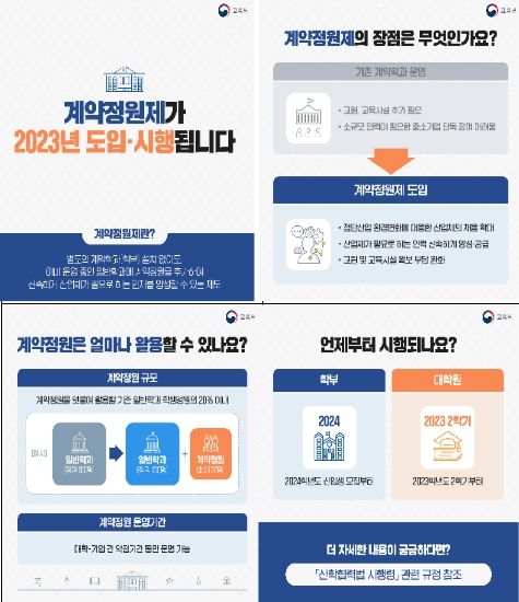 계약학과 제도의 규제가 대폭 완화됨에 따라 현장에서 계약학과를 설치·운영하는데 혼란을 방지하고 대학 담당자가 관련 내용을 충분히 이해할 수 있도록 5월 25일(목), 한국연구재단에서 계약학과 제도 설명회를 개최한다. 아울러, 대학과 기업 담당자 등의 행정 편의를 제공하기 위해 개정한 내용에 맞춰 제작한 업무설명서도 교육부 누리집을 통해 배포한다.