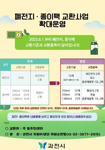 [제주교통복지신문 김강석 기자] 과천시는 현재 시행 중인 폐전지·종이팩 교환사업 활성화를 위해 오는 6월 1일부터 교환기준은 낮추고, 교환해주는 품목으로 종량제 봉투를 추가하여 운영한다고 밝혔다.