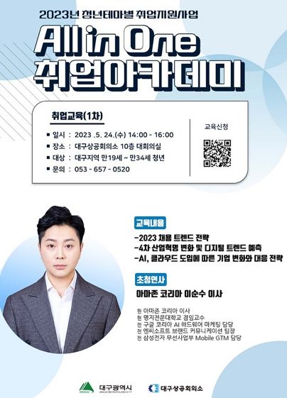 첫 번째 단계로 테마별 취업역량교육이 5월 24일 오후 2시 대구상공회의소 10층 대회의실에서 시작된다. 아마존코리아 이순수 이사가 강의를 진행하며 2023년 채용트렌드 전략, 4차 산업혁명 변화 및 디지털 트렌드 예측, AI·클라우드 도입에 따른 기업변화와 전략에 대해 교육을 진행한다. 참가 자격은 대구광역시에 거주하는 만 19세 ~ 만 34세 이하 청년들은 All in One 취업아카데미 홈페이지를 통해 교육 신청 후 참여할 수 있다.
