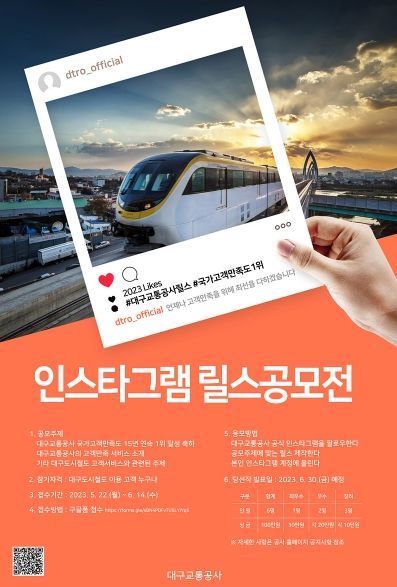[제주교통복지신문 김강석 기자] 대구교통공사는 국가고객만족도(NCSI) 15년 연속 1위 달성을 기념해 ‘인스타그램 릴스 공모전’을 개최한다.
