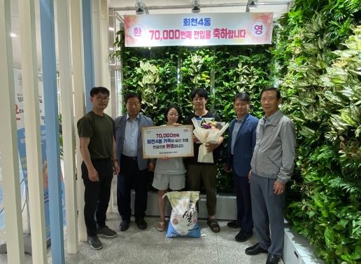 회천4동 사회단체협의회와 체육회는 이창열 회천4동장과 함께 지난 19일 7만 번째 전입자에게 환영기념 꽃다발과 양주골 쌀 20kg을 전달했다.