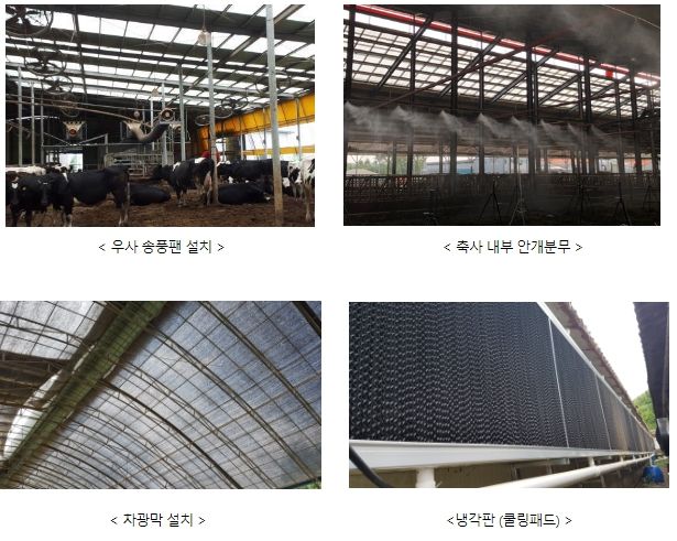 냉방설비가 거의 없는 개방형 축사에 있는 가축이 오히려 더위에 노출되기 쉽다. 송풍팬, 높낮이 조절 커튼(윈치커튼), 안개 분무 시설이 제대로 작동하는지 확인한다. 햇빛을 차단할 수 있는 그늘막을 설치하고, 열 차단 효과가 떨어지는 낡은 그늘막은 새것으로 교체한다. 지붕에는 해마다 단열 페인트를 새로 칠해주는 것이 바람직하다.