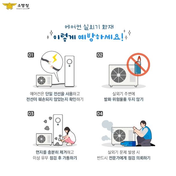 소방청은 피해 최소화를 위한 확실한 예방법은 사용 전 꼼꼼한 사전점검이라고 강조하며, 에어컨 사용 전 점검사항을 당부했다.