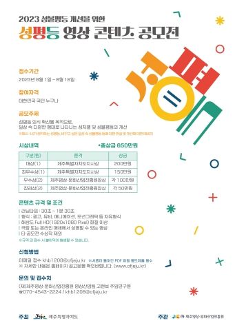 [제주교통복지신문 김현석 기자] 제주특별자치도와 (재)제주영상·문화산업진흥원은 ‘2023 성불평등 개선을 위한 성평등 영상콘텐츠 공모전’을 개최한다.
