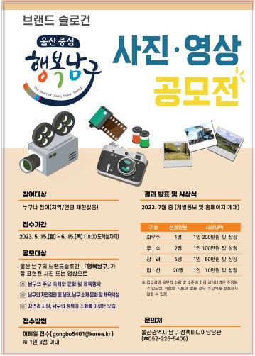 [제주교통복지신문 김강석 기자] 울산 남구는 지난 15일부터 6월 15일까지 한 달 간 브랜드 슬로건 ‘행복 남구’를 홍보하기 위한 사진‧영상 공모전을 개최한다고 밝혔다.
