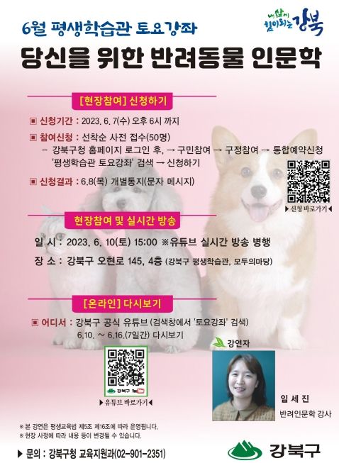 강연은 번동에 위치한 강북구 평생학습관(강북구 오현로 145, 4층)에서 개최되며, 임세진 반려인문학 강사가 진행한다.