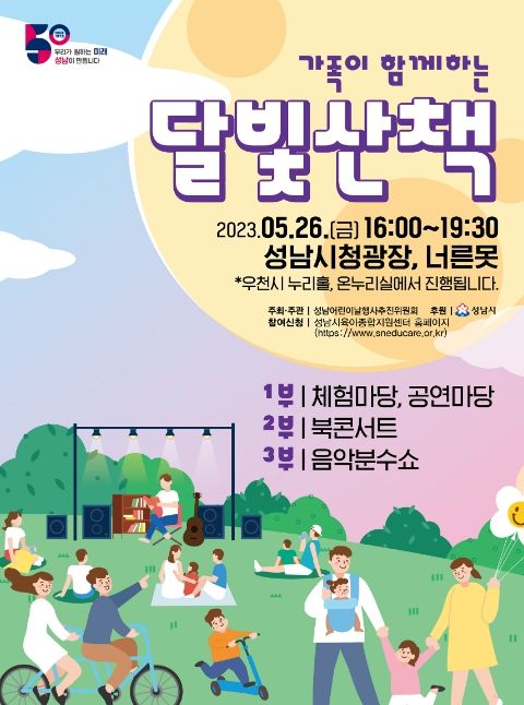 [제주교통복지신문 김강석 기자] 성남시는 오는 5월 26일 오후 4시~7시 30분 시청 곳곳에서 ‘가족이 함께하는 달빛 산책’ 행사를 개최한다.