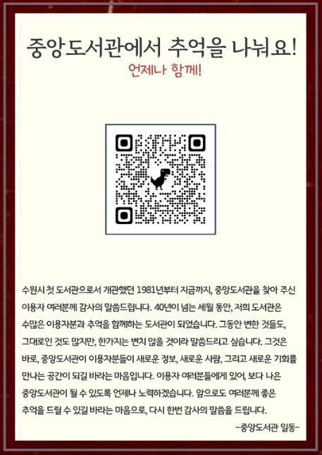 수원시 관계자는 “중앙도서관의 과거부터 현재까지 모습을 영상으로 제작했다”며 “시민들의 마음 한쪽에 언제나 자리매김하도록 노력할 것”이라고 말했다.