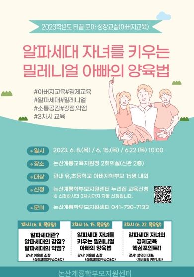[제주교통복지신문 김강석 기자] 논산계룡교육지원청은 6월 8일부터 22일까지 3주간 신관 제2회의실에서 2023학년도 아버지 학부모를 대상으로 티끌 모아 성장 교실(아버지 교육)을 운영한다.