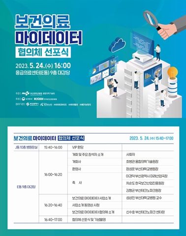 [제주교통복지신문 김강석 기자] 부산시는 오늘(24일) 오후 4시 부산대학교병원 응급의료센터 9층 대강당에서 보건의료 마이데이터 활용기술 연구개발·실증기관 간 긴밀한 협력을 위한 ‘보건의료 마이데이터 협의체 선포식’을 개최한다고 밝혔다.