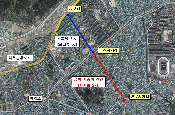이번 2차 사업 구간은 중구 복산사거리~반구사거리 길이 1.66km(양측)의 전선 및 통신선을 지중화하는 것으로 5월 25일 착공하여 오는 8월 준공된다.