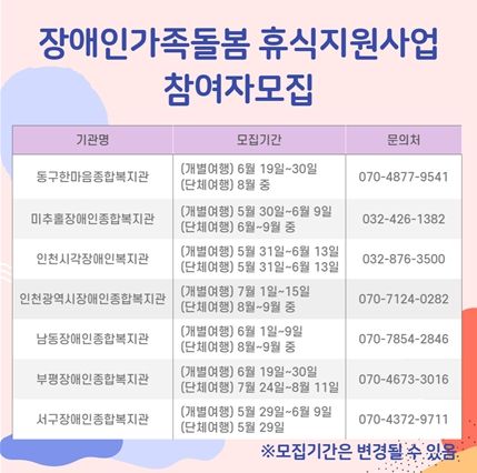 [제주교통복지신문 김강석 기자] 인천광역시는 ‘장애인 가족돌봄 휴식 지원사업’ 참여자 1,037명을 모집한다고 밝혔다.
