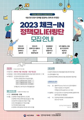 [제주교통복지신문 김강석 기자] (재)인천광역시여성가족재단(대표이사 김미애) 인천양성평등센터는 성인지 관점에서 지역정책을 모니터링하고 정책 개선 과정에 참여하고자 하는 인천시민을 대상으로 5월 15일부터 6월 9일까지 “체크-IN 정책모니터링단”단원을 모집한다.
