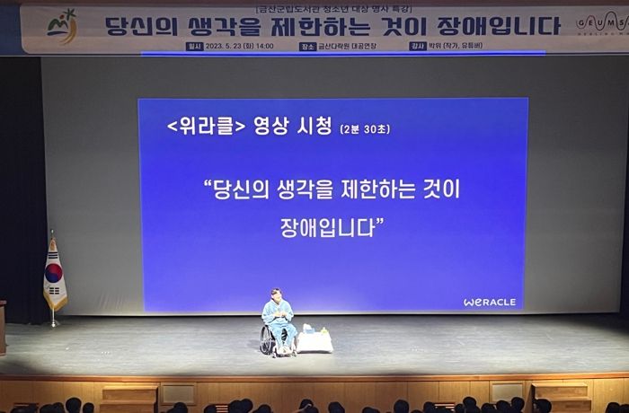 이번 특강은 관내 중학생 500여 명이 참여한 가운데 유튜브 ‘위라클’ 채널을 운영 중인 크리에이터 박위 씨를 초청해 ‘당신의 생각을 제한하는 것이 장애입니다’를 주제로 진행했다.