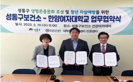 [제주교통복지신문 김강석 기자] 서울 성동구 보건소가 지난 10일 성동구 생명존중 문화 조성 및 자살예방을 위해 한양여자대학교 대학생활상담센터·인권센터와 업무협약을 체결했다.