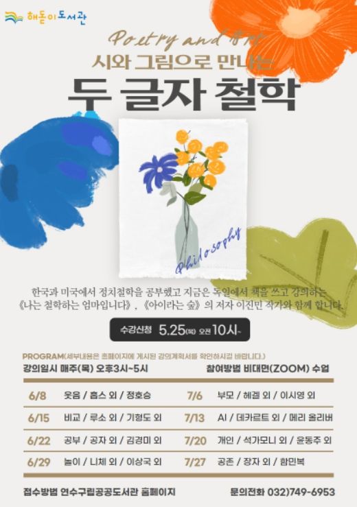 [제주교통복지신문 김강석 기자] 인천시 연수구 해돋이도서관은 내달 8일부터 7월 27일까지 총 8회에 걸쳐 인문독서 강연 ‘시와 그림으로 만나는 두 글자 철학’을 주제로 프로그램을 운영한다.