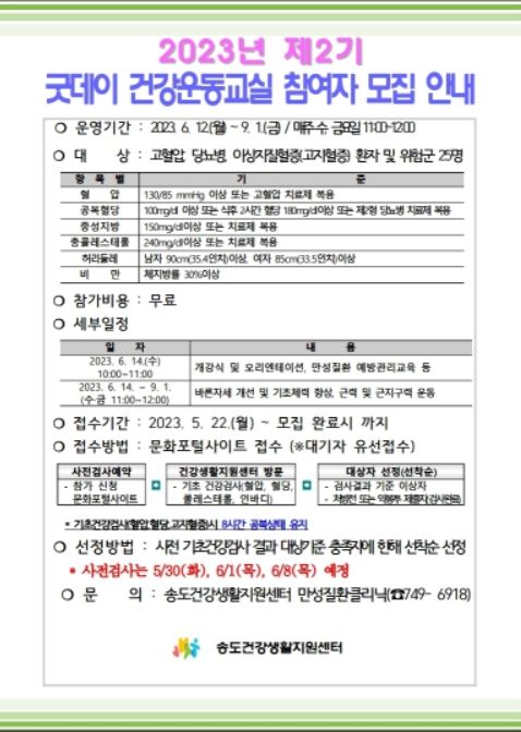 [제주교통복지신문 김강석 기자] 인천시 연수구 송도건강생활지원센터는 오는 31일까지 ‘굿데이 건강 운동 교실’ 2기 참여자를 선착순으로 모집한다.