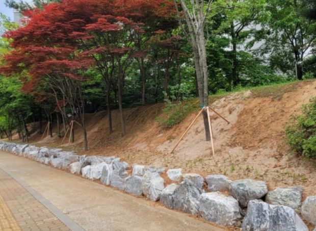 주요 사업내용은 토사유출 방지를 위한 조경석 쌓기, 경관 향상을 위한 가지치기 및 고사목 제거와 함께 관목 1,500주를 식재했다.