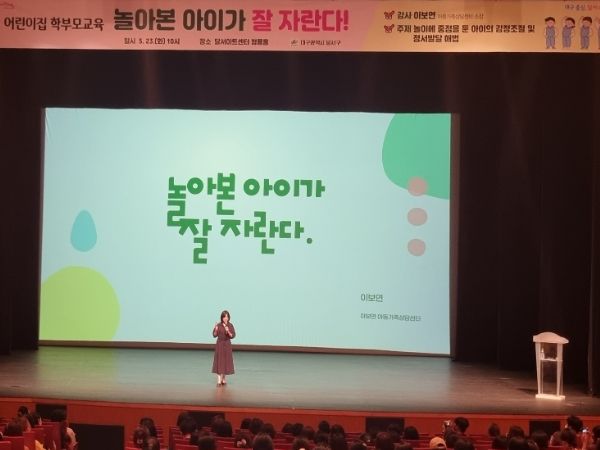 이번 교육은 달서아트센터 청룡홀에서 이보연 아동가족상담센터 소장 주재로 달서구 어린이집 학부모 500여명을 대상으로 진행됐다. 교육은 올바른 보육 정보를 제공하고자 주민참여예산으로 교육을 실시했다.